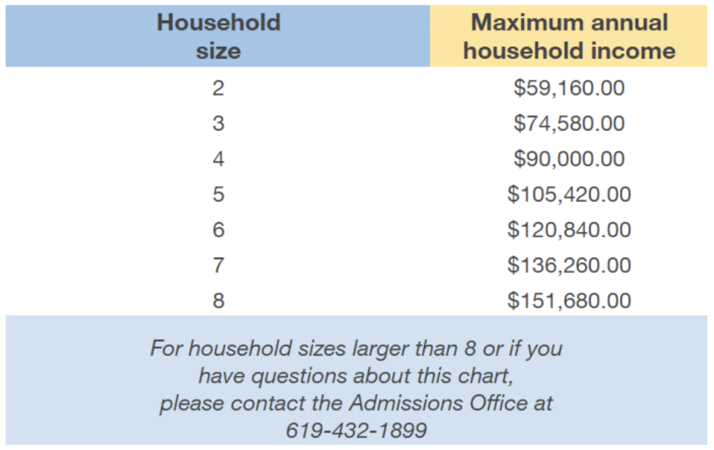 • The student's family must be financially eligible. All applicants are required to submit a Financial Aid Application to determine their eligibility. Please see the table below for current financial qualifications. If you have any questions, please call 619-432-1899 or email admissions@cristoreysandiego.org.